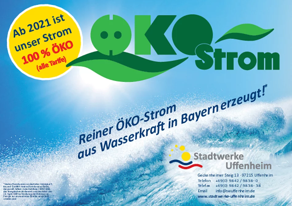 Die STADTWERKE UFFENHEIM stellen auf ÖKOSTROM um: ab dem 1. Januar 2021 beliefern wir alle Privat- und Kleingewerbekunden nur noch mit Ökostrom. Unser Ökostrom wird zu 100 Prozent aus Wasserkraft in Bayern erzeugt. Damit reduzieren wir den CO2-Ausstoß erheblich.